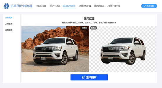 4、透明背景制作:AI识别图片中人像或物体,生成透明背景图片。