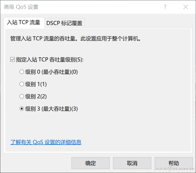 在它身上点击鼠标右键,选择“高级QoS设置”,在入站TCP流量选项卡中,勾选”制定入站TCP吞吐量级别“,选择最后那个”级别3“。