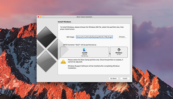 点击继续,然后点击选择并选择您新下载的ISO文件。 接下来,Boot Camp会要求您调整Windows分区的大小。 如果你打算下载和玩游戏或使用专业软件,你应该把它放大。