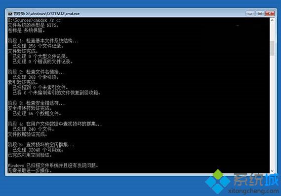 ▲最后输入chkdsk /r c:回车,系统会自动检查文件系统错误。检查完成之后再重启电脑,一般情况下即可恢复正常。不过在重启之前,建议再执行一下系统文件修复命令,以修复系统中可能已损坏的文件。方法: