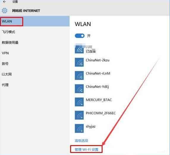 3、接着在左侧点击【WLAN】,在右侧点击【管理Wi-Fi 设置】,如下图所示。